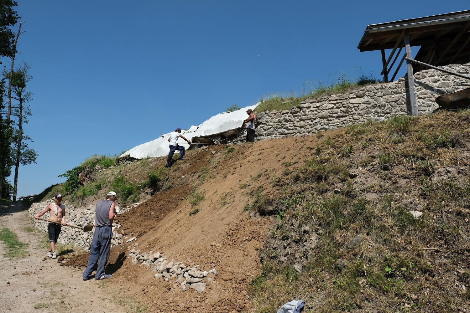 Počas júna sme začali realizovať archeologický výskum na Pustom hrade v sezóne 2019 a prípravu na pamiatkovú obnovu západnej hradby Dolného hradu. Najskôr sme opravili koruny múrov južnej línie opevnenia a tzv. spojovacieho múru ílovitou zeminou, vyčistili areál Dolného hradu od náletovej vegetácie a pomohli s jeho pokosením. Následne sme spevnili svah po západnou hradbou Dolného hradu na-sucho uloženým múrom a ílom, ktorý sme zatrávnili. Zabránime tak jeho erózii. Roztriedili a pripravili sme kameň pre murárske práce súvisiace s obnovou západnej línie opevnenia medzi hlavnou vstupnou bránou a kráľovskou vežou Dolného hradu, ktorej celková dĺžka je takmer 69 metrov, hrúbka 2,5 metra a zachovaná výška 1,5 – 2,9 metra. Túto hradbu sme aj kompletne preskúmali a začistili pred jej následnou stavebnou sanáciou, a tiež kresebne, geodeticky a fotogrametricky zdokumentovali. Jej obnova sa bude realizovať s podporou Mesta Zvolen a programu Obnovme si svoj dom Ministerstva kultúry SR.