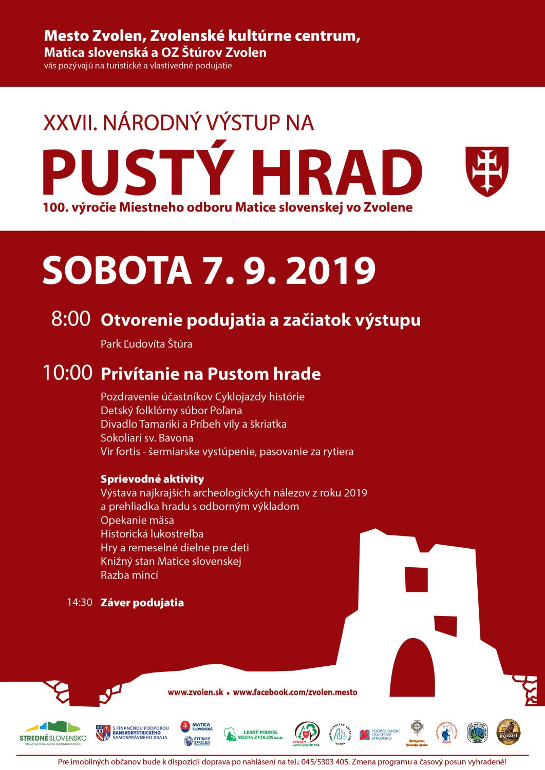 Už najbližšiu sobotu 7.9.2019 sa uskutoční XXVII. ročník Národného výstupu na Pustý hrad s bohatým programom. Aj tento rok sme pre účastníkov pripravili odborný výklad o výsledkoch archeologického výskumu, najnovšie pohľadnice a prospekty o Pustom hrade i Pohronskej hradnej ceste. Nezabudneme ani na ukážku najkrajších archeologických nálezov z tohtoročnej výskumnej sezóny.